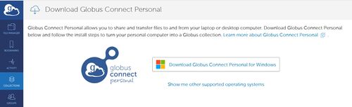 - Select File Manager > Your Collections. Then select Get Globus Connect Personal