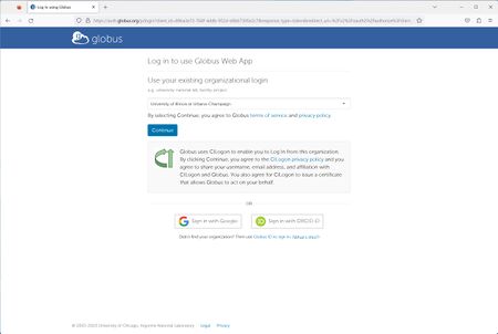 • Connecting to Globus is a two-step process. First, you log in to the Globus service itself. Then you can log in to a specific collection.