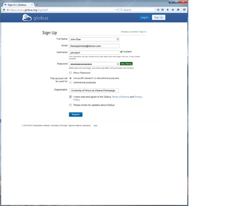 - Enter the necessary information in its respective field. This account is not affiliated with the University of Illinois or IGB, so the username will be specific for Globus only.