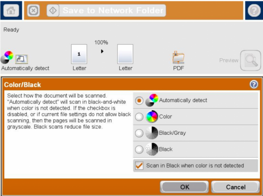 The following screen will allow you to change the coper from black and white to color. This setting should not need to be changed as it is set to automatic by default. If you would like a color document scanned in black and white only, use this setting.