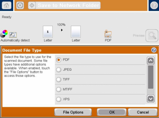 - PDF: This is the default file type. This file type provides the best overall image and text quality. PDF files require software that can open the file for viewing such as Adobe Acrobat Reader.