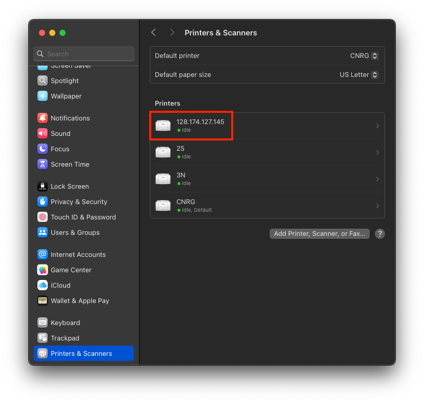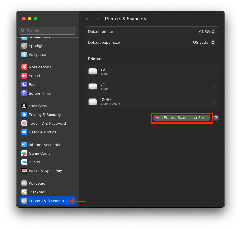 - Open System Settings and scroll down to "Printers & Scanners". Click on "Add Printer, Scanner, or Fax..."