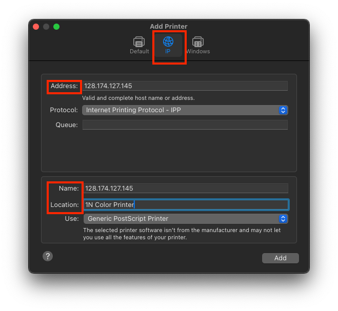 - Enter the printer's IP address in the Address field (128.174.XXX.XXX).