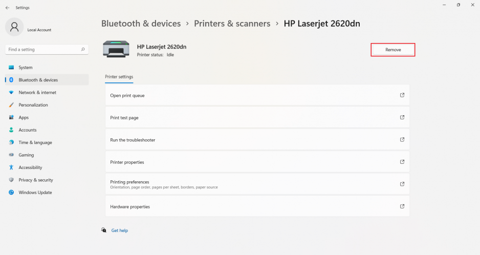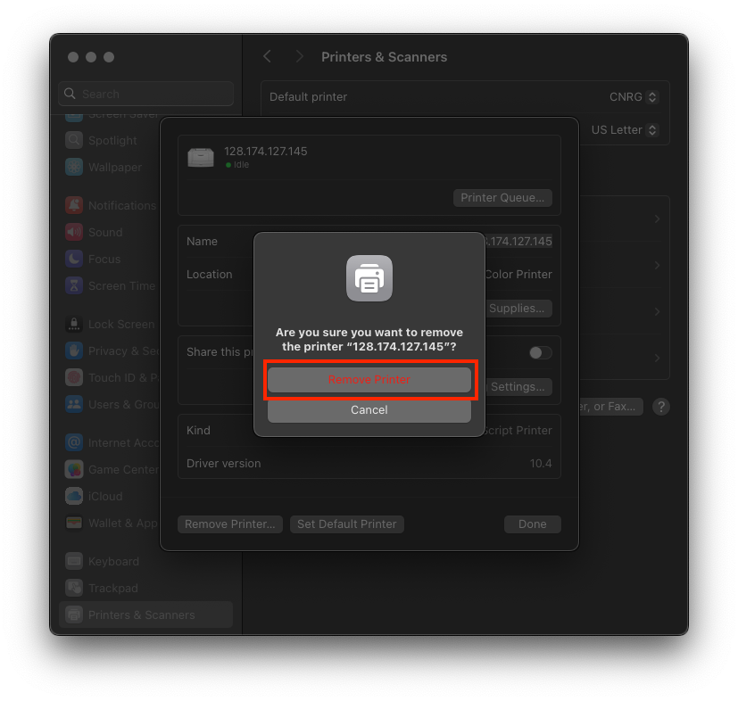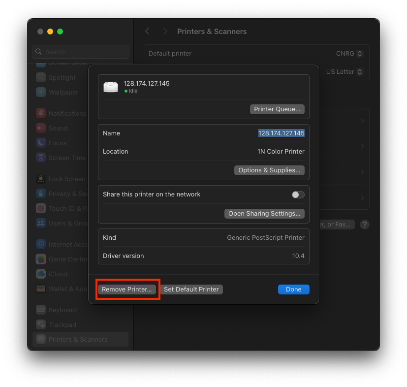 - Click "Remove Printer..." and confirm that you want to remove the printer.