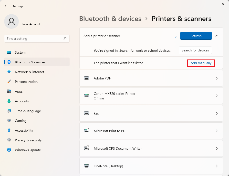 - Click "Add device" and then click "Add a new device manually" next to "The printer that I want isn't listed".
