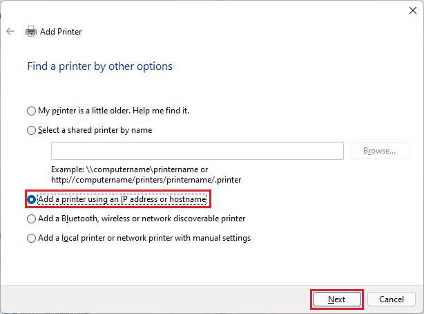 - Select "Add a printer using an IP or hostname," then click "Next".
