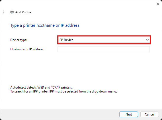 - Choose "IPP Device" from the "Device type" dropdown menu, then enter the IP address of the printer and click "Next".