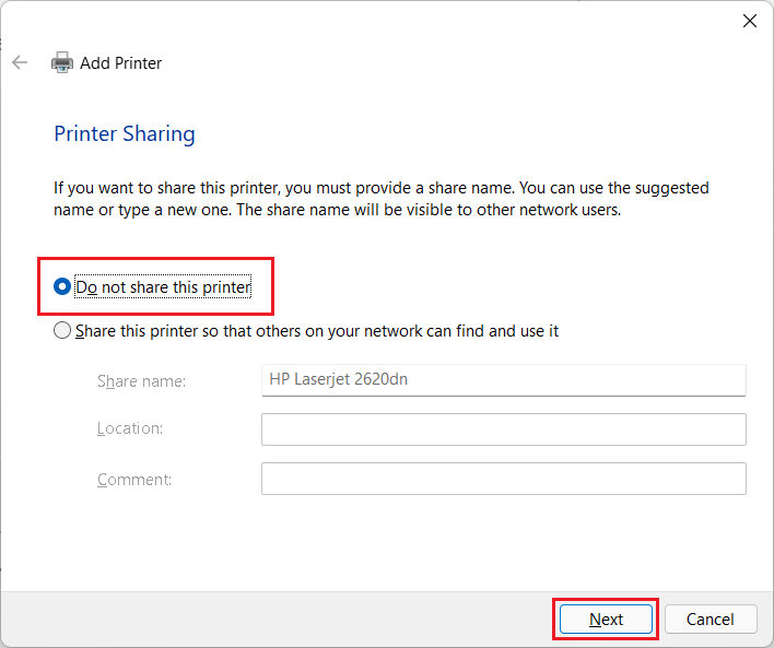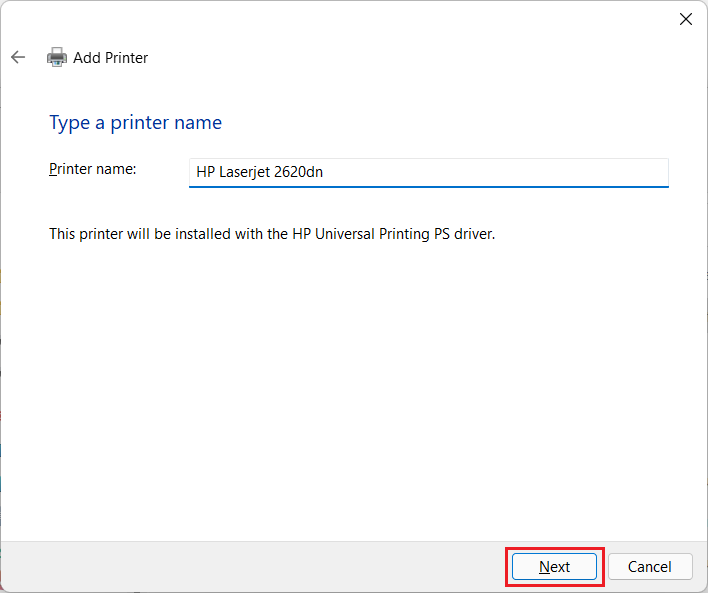 - Enter the name and location of the printer. This is how the printer will be labeled for your computer.