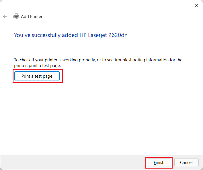 - Click "Print a test page" to confirm that you are able to print from the printer. Once the test print comes out, click "Finish".