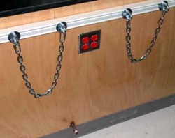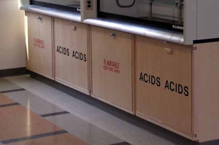 Please minimize quantities of hazardous materials such as flammable liquids and gases and strong acids and bases in the labs. Store larger containers of flammables and caustics in the cabinets provided for that purpose.
