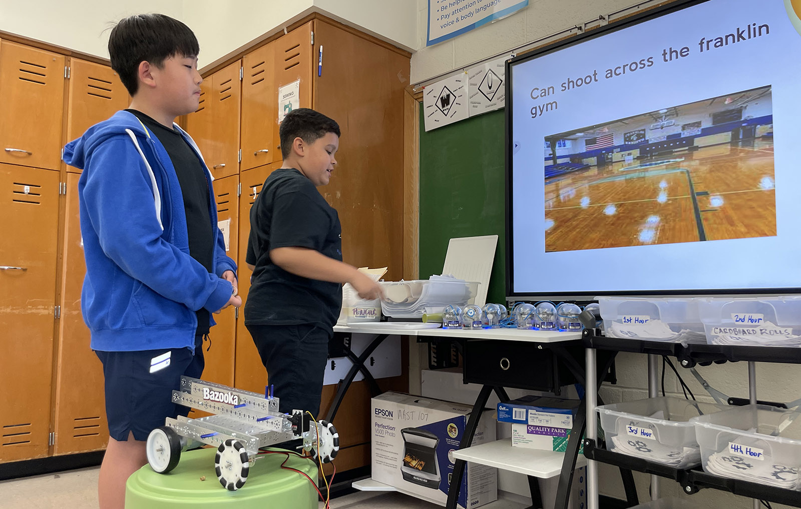 One team found clear differences in fish survival based on temperature that they related to the impacts of global warming. Another team found that they could consistently get their bazooka to shoot tiny projectiles over 45 feet after tinkering with the stability of the design. During the trebuchet team’s demonstration, the students explained how magnetic attraction creates force energy that quickly rotates the trebuchet's arm, clarifying that this was different from the kinetic energy that standard trebuchets use.