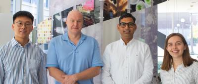 Left image: First author of the study Xuenan Mi received an award in 2024 for her work on LassoESM. Right image: Professor Doug Mitchell, Professor Diwakar Shukla, and Susanna Barrett